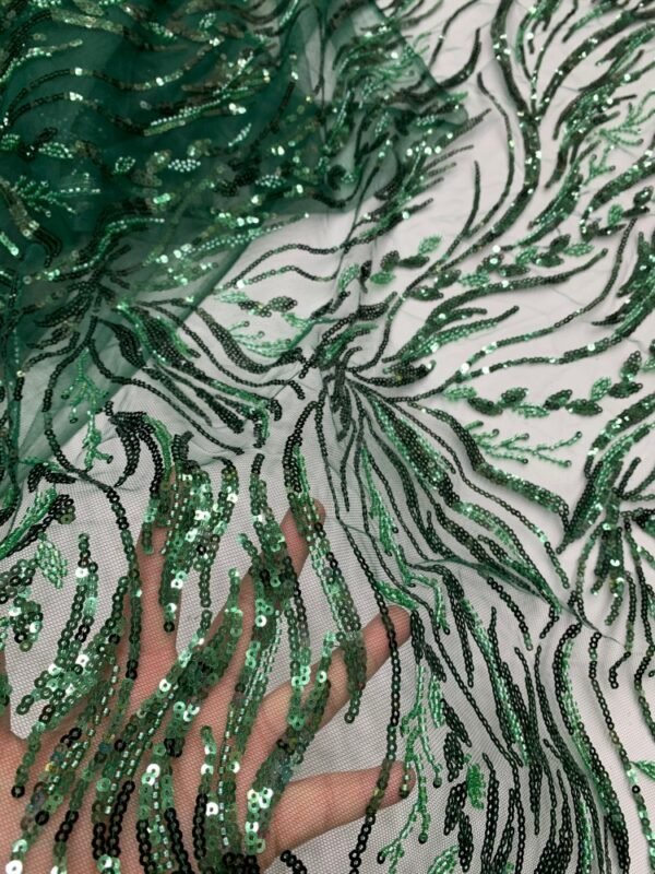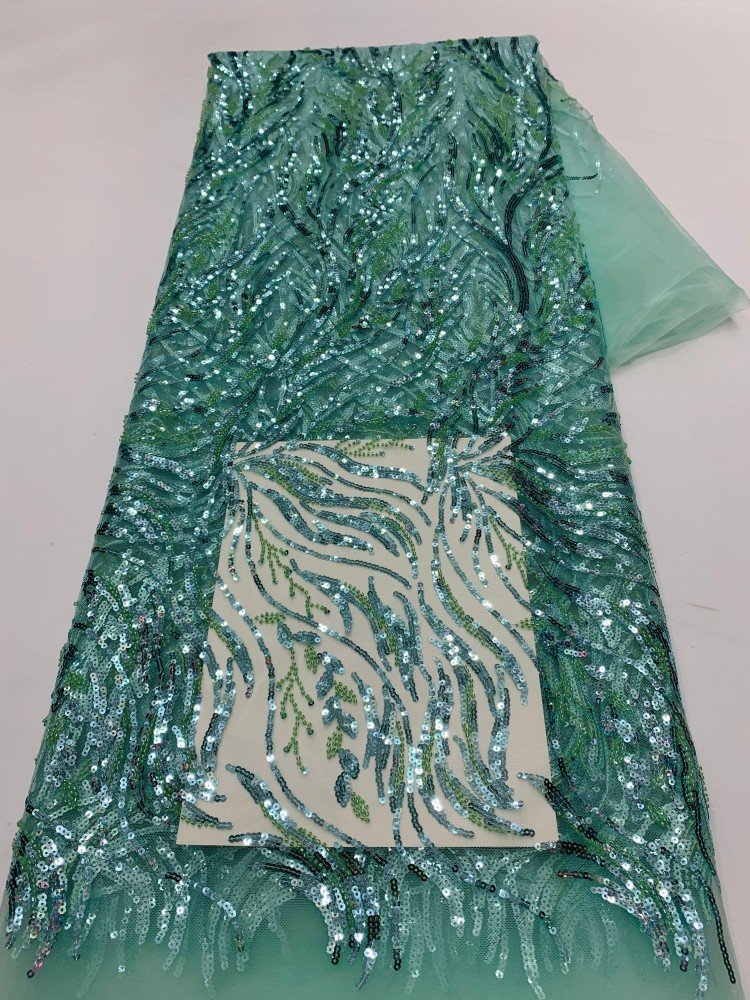 Stylish mint green mesh fabric covered with oversized sequins, ideal for luxury gowns, dresses, and event decorations.